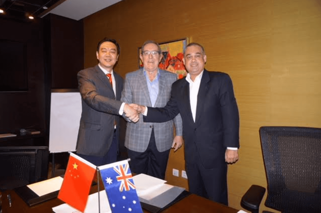 Raymond Dong (Global Village-CEO), David DeCampo & Christopher Neil - signing ceremony Aeyons, Orient Group & Global Village MOU
